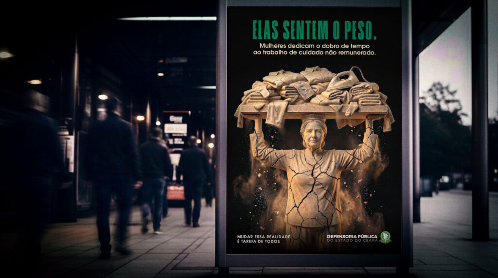 O filme, produzido pela Duozz Filmes, e o spot, produzido pela Balancê, traduzem em narrativa e sensibilidade a sobrecarga do cuidado não remunerado. Já a comunicação visual, executada pela Somma Comunicação Visual, reforça a força conceitual da campanha ao transformar em imagem o peso invisível que sustenta a rotina, a casa, a família e a sociedade. No material criativo, a campanha destaca que “mudar essa realidade é tarefa de todos”, propondo uma reflexão coletiva sobre corresponsabilidade, equidade e reconhecimento.