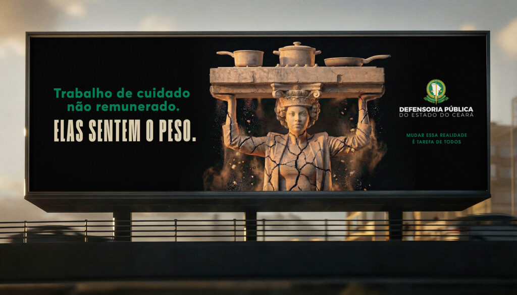 A linha gráfica se apropria de uma linguagem visual universal: a das esculturas clássicas que sustentam estruturas arquitetônicas. Ao trazer essa referência para o universo do cuidado não remunerado, a campanha constrói uma metáfora direta: mulheres que sustentam o funcionamento da casa, da família e da sociedade. Assim como nas esculturas, elas aparentam força e estabilidade. No entanto, ao contrário da pedra, são humanas e estão sob pressão constante. As rachaduras presentes nas peças visuais tornam visível o desgaste provocado pela sobrecarga, transformando uma sensação abstrata em algo concreto e quase palpável.