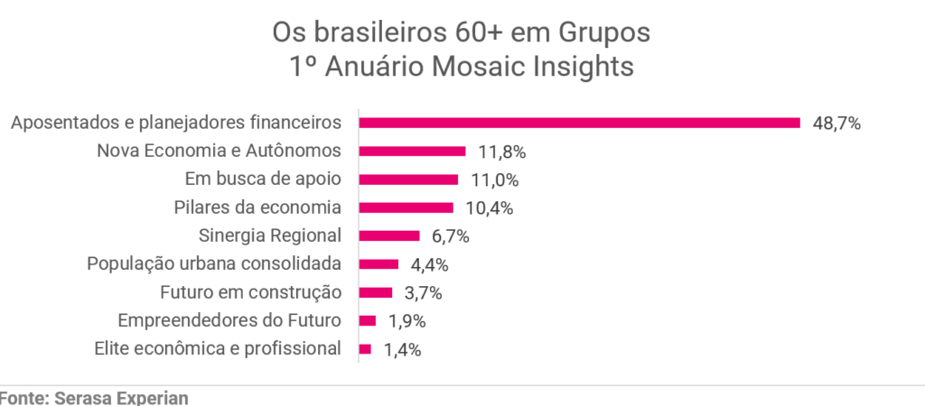 A CMO e Vice-Presidente de Marketing Solutions da companhia, Giovana Giroto, explica que “os resultados também ajudam a desmistificar a ideia de que o público acima de 60 anos forma um grupo homogêneo. Na prática, a única coisa realmente em comum entre eles é a idade”. A concentração do público 60+ se dá principalmente no grupo “Aposentados e Planejadores Financeiros”, que reúne quase metade desse universo, com 48,7%. Ainda assim, o Anuário aponta presença relevante em outros perfis e reforça a percepção de que a população 60+ é mais diversa do que sugere o senso comum. Entre esses segmentos, destacam-se “Autônomos e Nova Economia” (11,8%), caracterizado por renda variável e múltiplas fontes de receita; “Em busca de apoio” (11,0%), marcado por um consumo mais funcional e acesso restrito ao crédito; e “Pilares da Economia” (10,4%), que representa a base produtiva e trabalhadora, com alta sensibilidade a preços. Os 18,1% restantes se distribuem entre outros cinco grupos, entre eles a “Elite Econômica e Profissional” (1,4%), cuja participação fica levemente acima da média nacional, de 1,3%. Confira abaixo o detalhamento dos 60+ em todos os clusters do Mosaic: