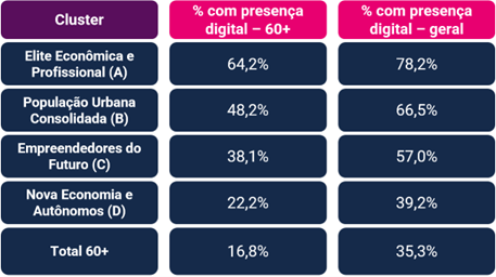 Presença digital: média baixa, mas com picos altos nos perfis estáveis No ambiente digital, o estudo também traz uma leitura com nuances. Em média, apenas 16,8% do público 60+ apresenta consumo digital ativo. No entanto, entre os grupos considerados mais estáveis, como a “Elite Econômica e Profissional”, esse percentual ultrapassa 60%, ficando apenas 14 pontos percentuais abaixo da média nacional. O detalhamento dessa presença entre os perfis mais estáveis está apresentado na imagem abaixo: