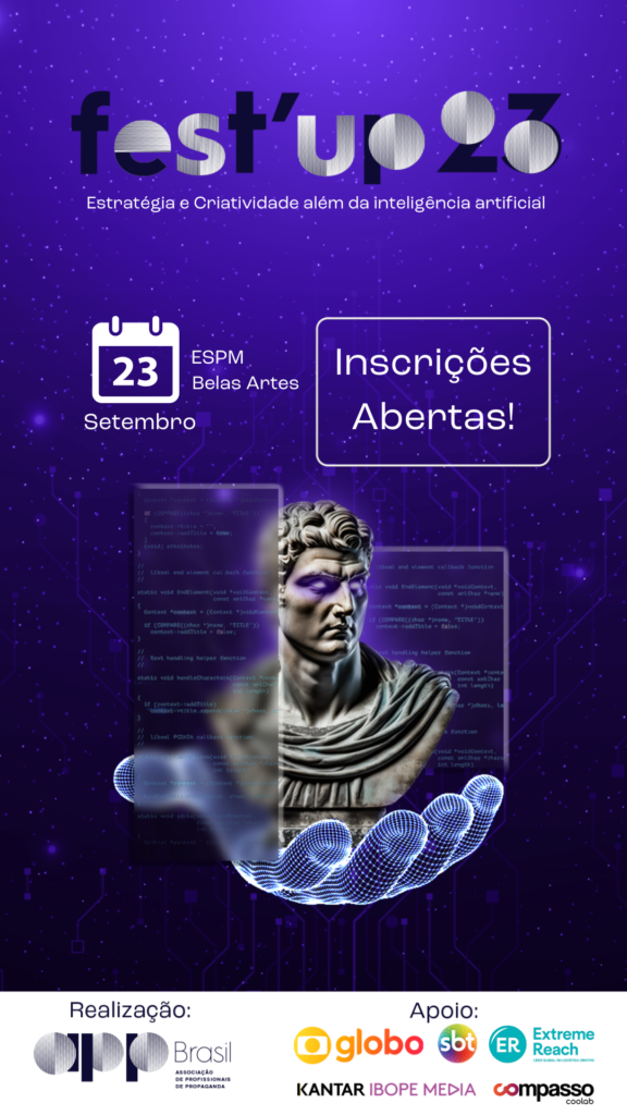 As inscrições já estão disponíveis e podem ser realizadas neste link. Para viabilizar o Fest’UP 2023, a APP Brasil conta com o apoio da Globo, Extreme Reach, Kantar Ibope Media, SBT, Folha de S. Paulo, Compasso Coolab, ESPM e Belas Artes.