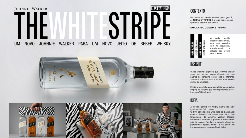 A campanha “The White Stripe” adapta Johnnie Walker à trend “zebra striping” de alternar álcool e não álcool, criando o “White Label” (água) para intercalar com o whisky e alinhar a marca ao consumo da Gen Z.