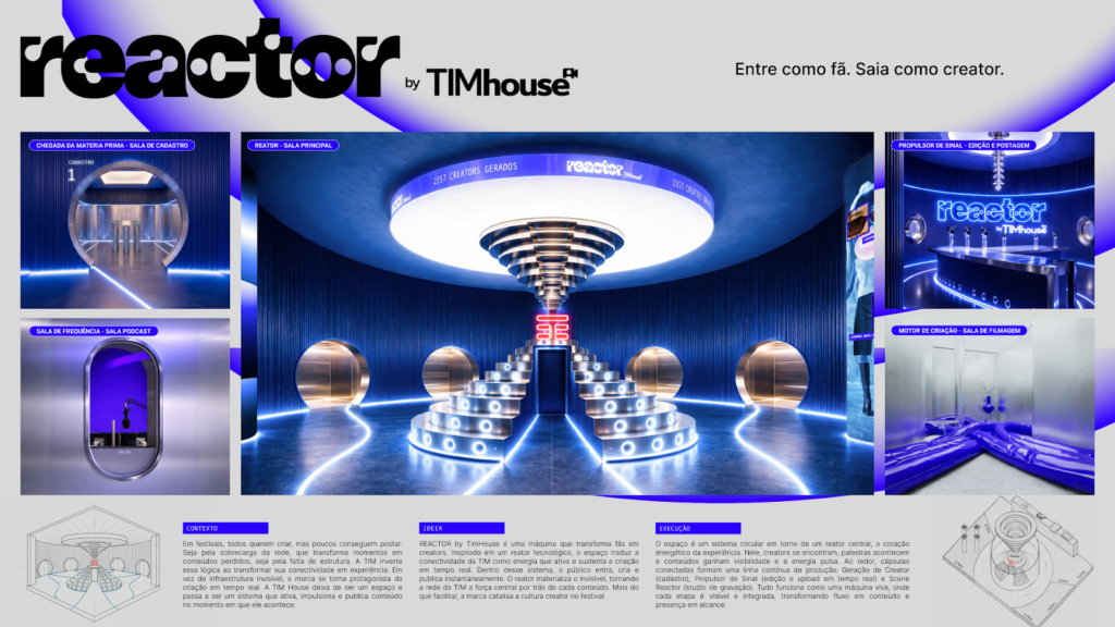 A campanha “REACTOR by TimHouse” transforma a conectividade da TIM em uma experiência de criação em tempo real nos festivais, permitindo que fãs produzam e publiquem conteúdo instantaneamente. O espaço funciona como um sistema integrado que converte participação em conteúdo e alcance, colocando a marca como protagonista da cultura creator.